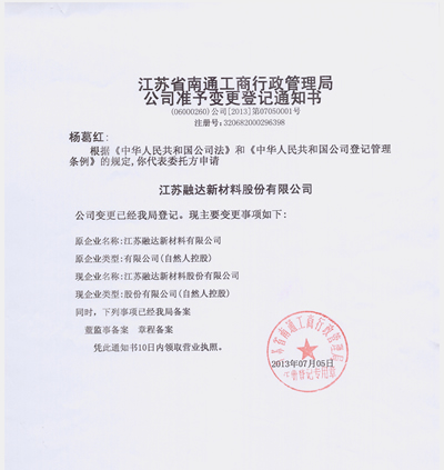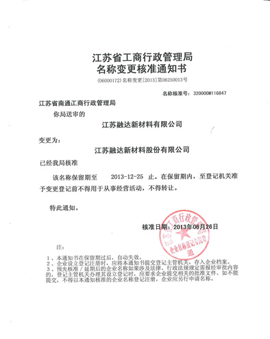 為推動(dòng)可持續(xù)發(fā)展,為公司邁入資本市場(chǎng)做準(zhǔn)備,公司全體股東投票決定同意將江蘇融達(dá)新材料有限公司更名為江蘇融達(dá)新材料股份有限公司,并提交江蘇省工商行政管理局審批通過。