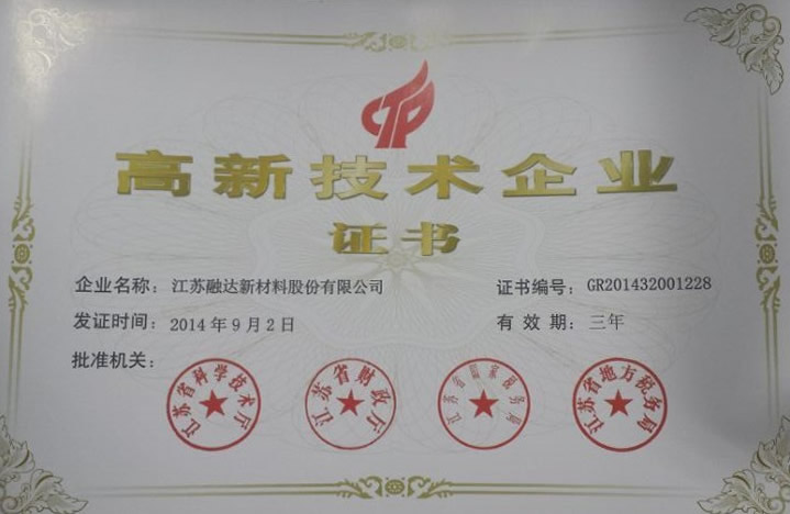 據(jù)《江蘇省高新技術(shù)企業(yè)認定管理工作協(xié)調(diào)小組文件》公告:“江蘇融達新材料股份有限公司”被認定為江蘇省2014年高新技術(shù)企業(yè)!這是繼“融達新材料”在上海股交所成功掛牌后的又一大喜事!