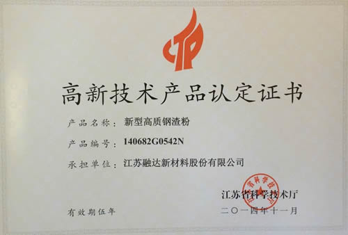 2014年11月3日,從江蘇省科技廳傳來(lái)喜訊,江蘇融達(dá)新材料股份有限公司的“新型高質(zhì)鋼渣粉”正式通過(guò)江蘇省高新技術(shù)產(chǎn)品認(rèn)定,獲江蘇省高新技術(shù)產(chǎn)品稱(chēng)號(hào)。