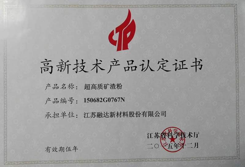 2016年1月,從江蘇省科技廳傳來喜訊,江蘇融達(dá)新材料股份有限公司的“超高質(zhì)礦渣粉”正式通過江蘇省高新技術(shù)產(chǎn)品認(rèn)定,獲江蘇省高新技術(shù)產(chǎn)品稱號(hào)。